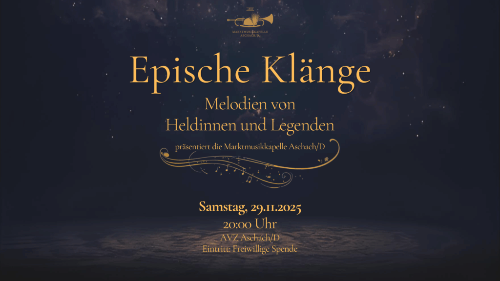Unter dem Motto „Epische Klänge – Melodien von Heldinnen und Legenden“ präsentieren wir euch bei unserem bevorstehenden Konzert ein abwechslungsreiches Programm, das verschiedene Melodien aus Film, Radio und klassischer Musik vereint – von der weltbekannten Morgenmelodie von Peer Gynt bis zu den besten Hits von Adele!